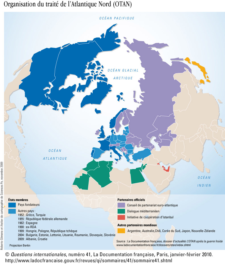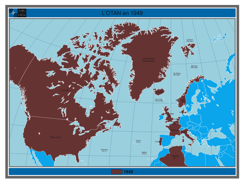 signification : Organisation du Traité de l’Atlantique Nord créée en 1949. Son objectif est de créer des accords de défense entre 17 États européens, les États-Unis et le Canada.