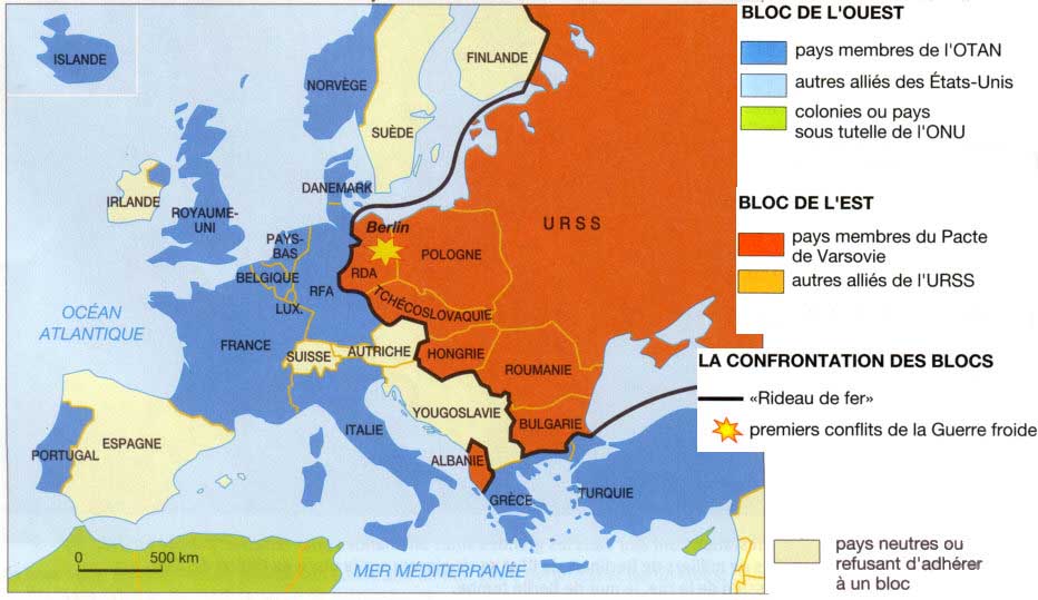 signification : l’expression « rideau de fer » est inventée le 5 mars 1946 par Churchill, ancien premier ministre britannique. Durant la Guerre froide, le rideau de fer désigne la frontière qui sépare l’Europe en deux blocs. Cette frontière est militarisée c’est-à-dire qu’elle est clairement rendue visible par la présence de chars d’assaut, de troupes militaires, de murs et de barbelés. Ce rideau de fer s’étend sur environ 8500 kilomètres.