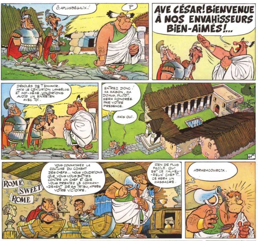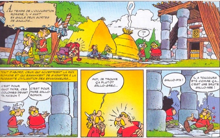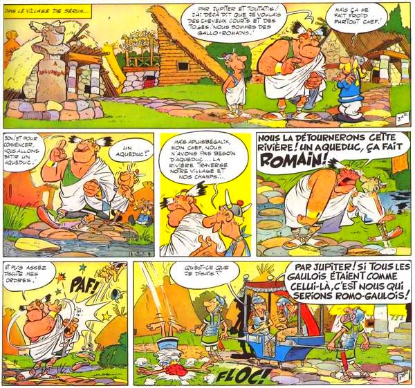 signification : au IIᵉ siècle, adoption du mode de vie, de la langue et des croyances des romains par différents peuples de l’Empire (exemple : la romanisation de la Gaule au travers de la BD « Astérix, le combat des chefs » : extrait 1 ; extrait 2 ; extrait 3).